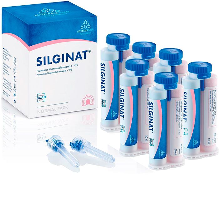 Silginat для ручного замешивания от производителя Kettenbach - среднетекучий, эластомерный A-силикон в больших картриджах 5:1 и в обычных картриджах 50 мл, разработан специально для тех областей, где используется альгинат (например, анатомические оттиски).