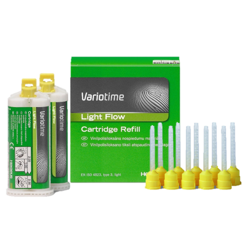 Variotime Light Flow от производителя Heraeus Kulzer — А-силиконовый материал для снятия оттисков тип 3 (очень низкой вязкости), для коррекции оттисков, в картриджах по 50 мл, для автоматического смешивания в пистолете смесителе 1:1 или 2:1.