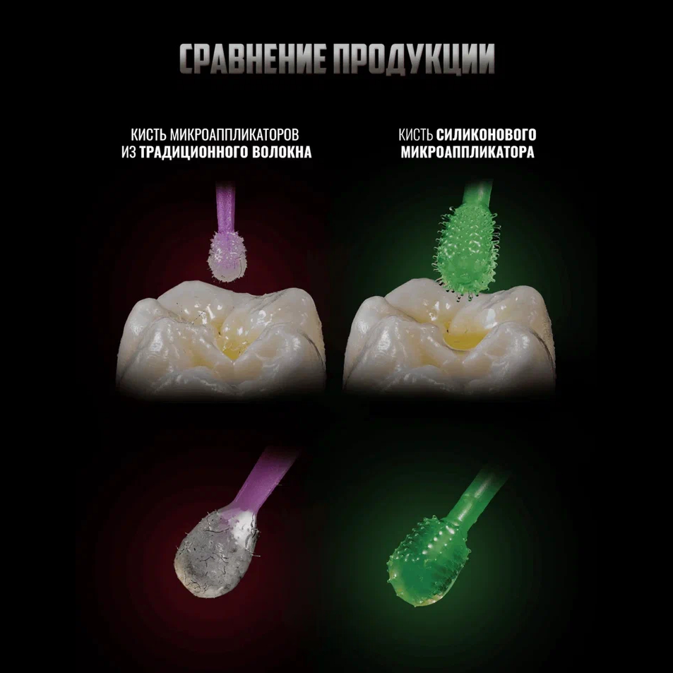 - После погружения в раствор не образуется замкнутых пространств между щетинками, как в обычных аппликаторах из клея и волокна, в результате чего жидкий материал остается на головке кисточки, а значит, минимизируются затраты и снижается риск попадания лишнего материала на место процедуры.
