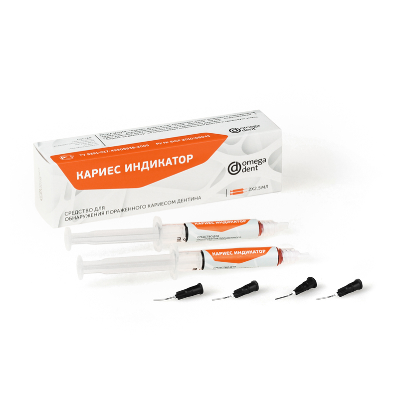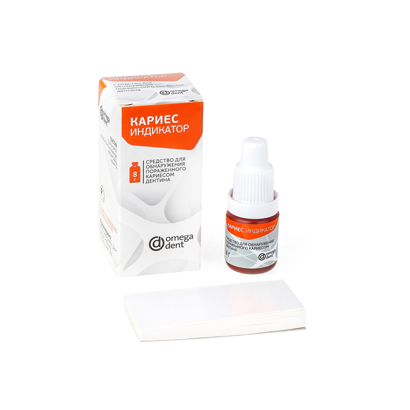 Кариес индикатор от производителя Омега-Дент позволяет легко различить пораженный кариесом и деминерализованный слой дентина путем окрашивания в ярко-красный цвет наружных слоев кариозного дентина.