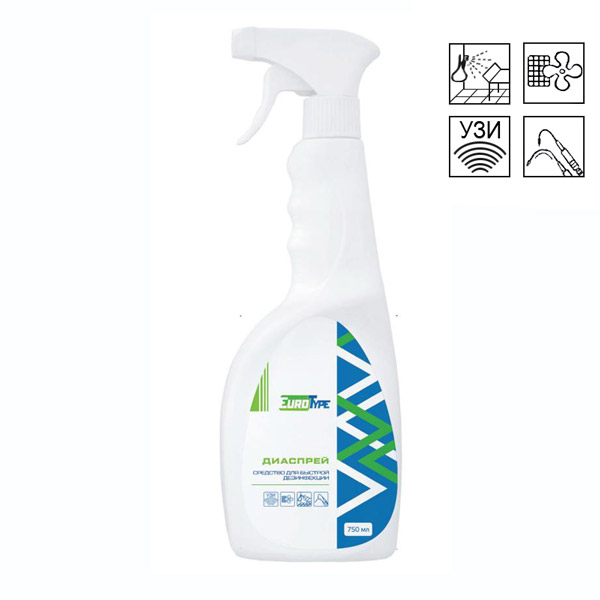 Средство дезинфицирующее "Диаспрей" от производителя EuroType — готовое к применению спиртосодержащее дезинфицирующее средство в виде спрея. Изготовлено на основе изопропилового спирта (30%). Предназначено для быстрой дезинфекции небольших по площади поверхностей и оборудования. Рекомендуется к применению в медицинских, социальных, детских учреждениях и в быту. Обладает высокой антимикробной активностью. Эффективно против большинства вирусов (включая COVID 19) и бактерий (включая микобактерии туберкулеза).