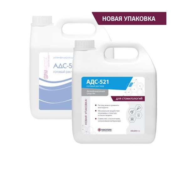 АДС-521 от производителя Ниопик — средство для дезинфекции стоматологических оттисков, зубопротезных заготовок из разных материалов, коррозионностойких артикуляторов и слепочных ложек - путем их погружения в неразбавленный раствор АДС-521 на 10 мин.