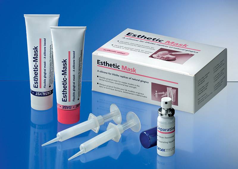 Esthetic Maskот производителя Detax — мягкая десневая маска на основе А-силикона предназначается для изготовления зуботехнических мастер-моделей и разборных моделей, холодного отверждения, размеростабильная, особо эластичная и особенно прочная.