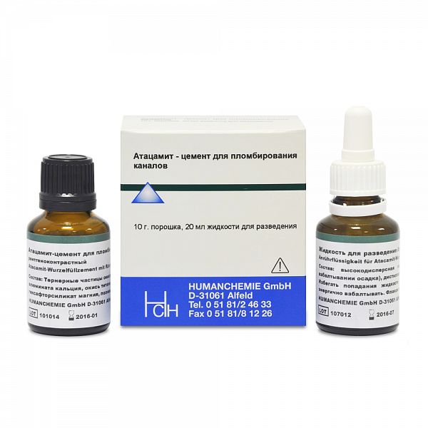 Атацамит от производителя Humanchemie – щелочной цемент малой твердости с замедленным связыванием для пломбирования канала после завершения лечения методом депофореза.