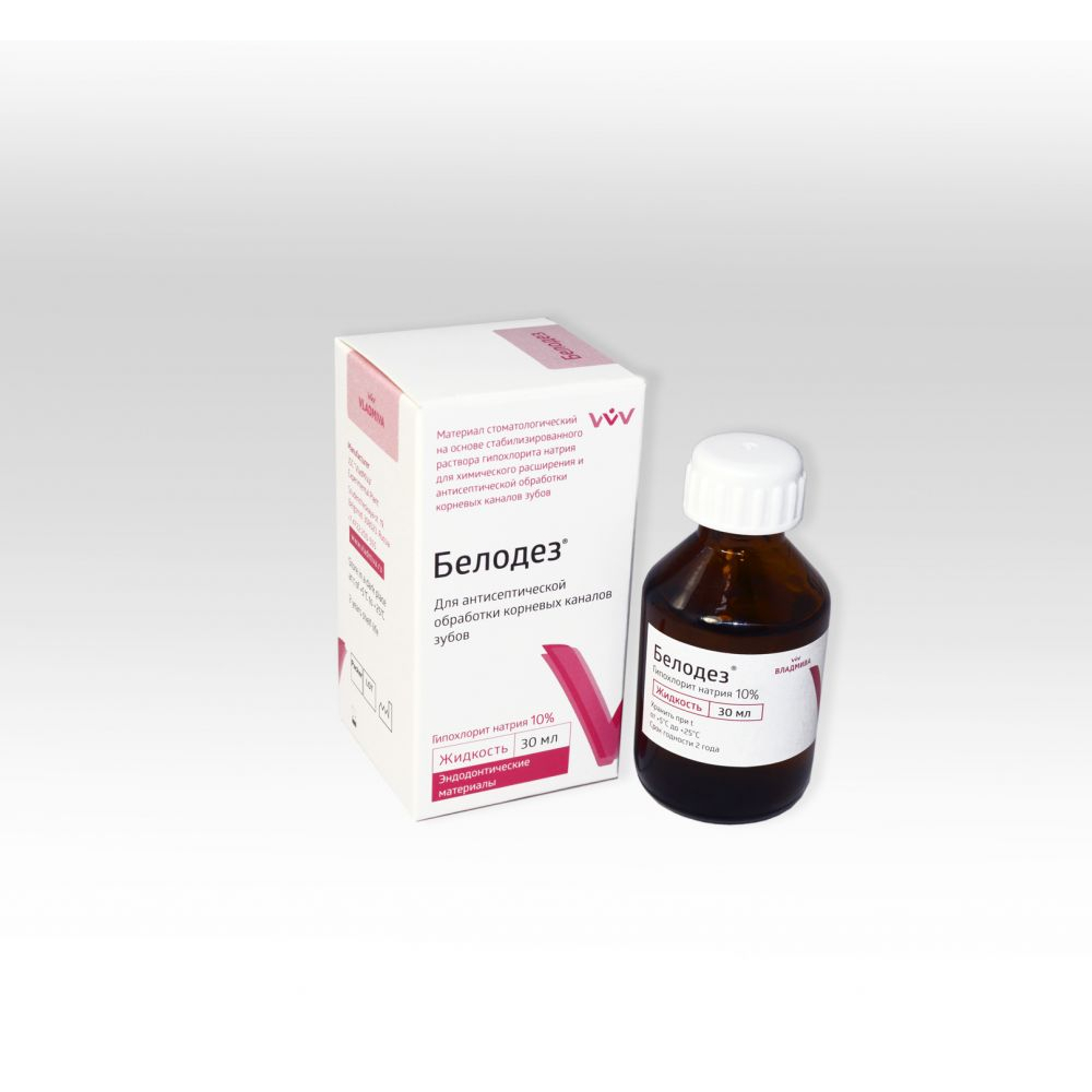Белодез 10% — жидкость стоматологическая на основе стабилизированного раствора гипохлорита натрия для химического расширения и антисептической обработки корневых каналов зубов.