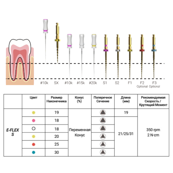 - Переменная конусность, повышенная прочность, укороченный хвостовик - всё для более качественного удаления дентинных опилок и лучшей обработки корневого канала.