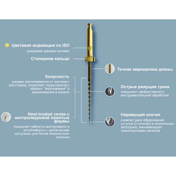 - Безопасносный скругленный нережущий кончик снижает до минимума вероятность отклонения от хода канала.