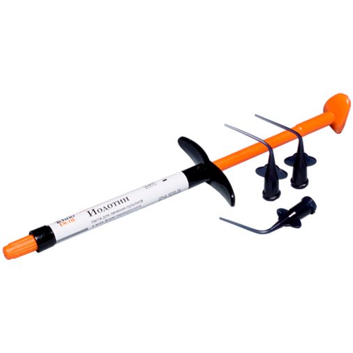 - При лечении ввести носик канюли в канал и без особых усилий на поршень внести пасту Иодотин в верхнюю часть канала, изолировать ватной турундой и запломбировать полость временным пломбировочным материалом («Темподент»), избегая компрессии. Пасту можно оставлять в корневом канале от 7-8 дней до 1 месяца под наблюдением.