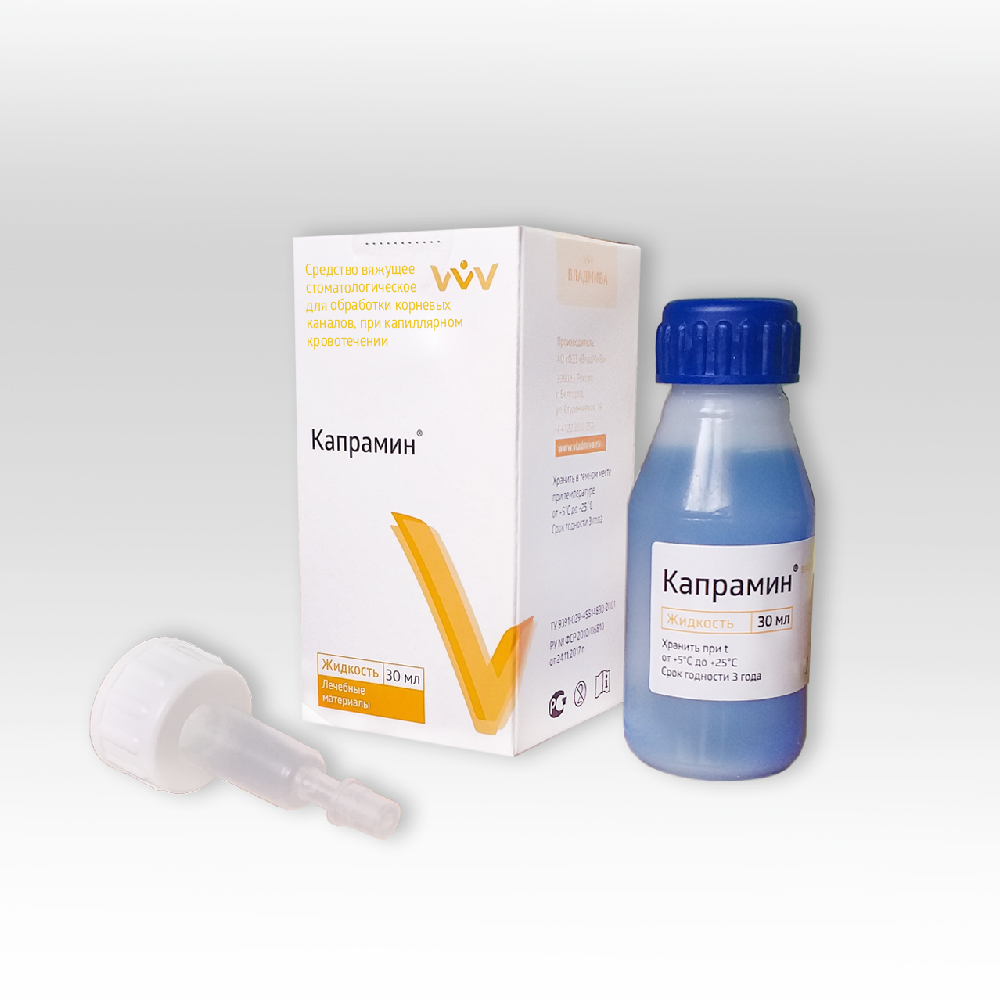Капрамин, от производителя Владмива - гемостатическое средство при капиллярном кровотечении из десны, для обработки зубных лунок и после прямого снятия слепков, для ретракции десны, при снятии камней, а также для обработки корневых каналов при кровотечении из канала.