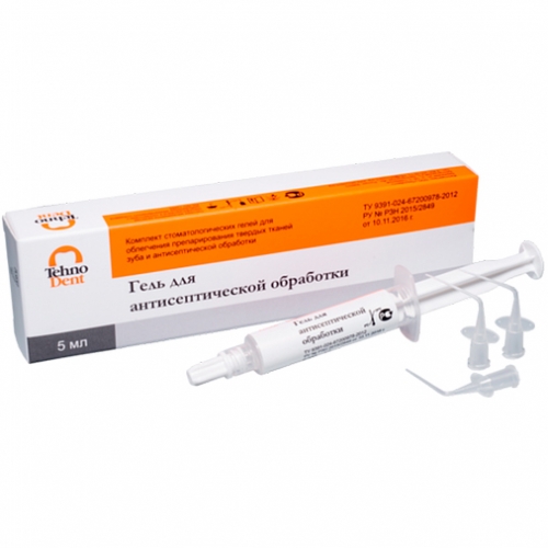- Антисептический гель содержит: хлоргексидина биглюконат (2 %) – антисептик, активно подавляющий анаэробную флору корневых каналов зубов. Благодаря гидрофильной основе гель легко вводится в каналы, глубоко проникает в дентинные канальцы и легко вымывается водой из корневых каналов.