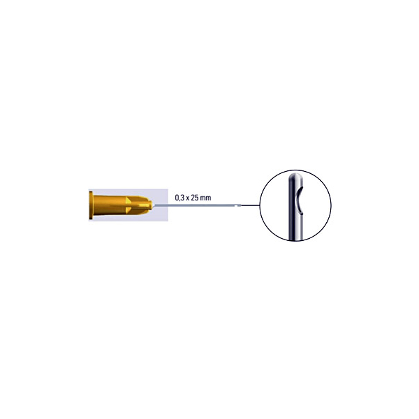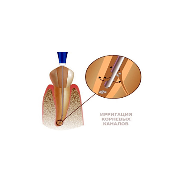 - Особая проточка иглы позволяет жидкости устремиться в нужном направлении — прямо в корневой канал, в результате чего антисептический раствор удается направить собственно в пульповую камеру.