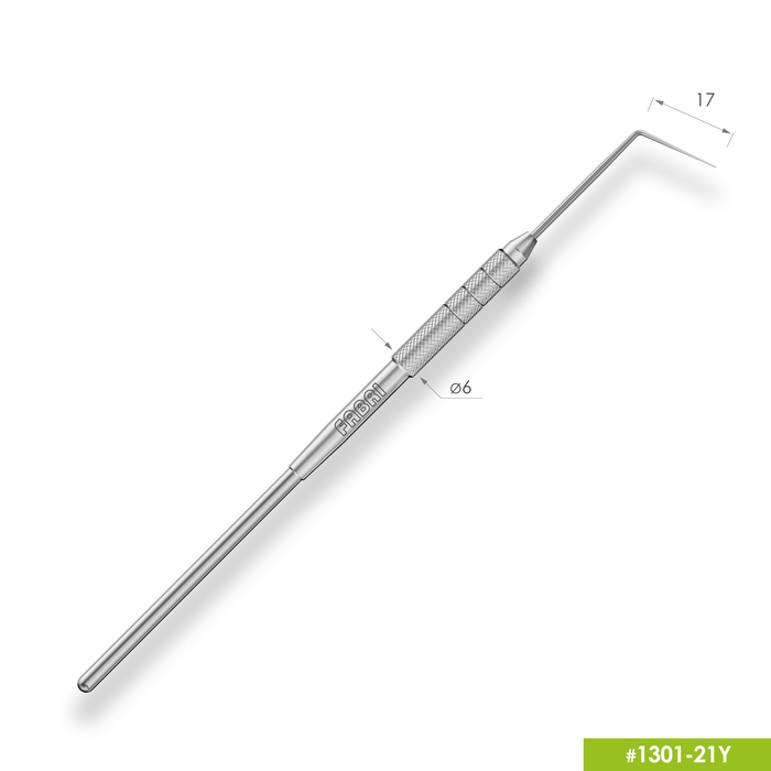 1301-21# Улучшенный зонд общего обследования от производителя Fabri — односторонний зонд с одинарным изгибом. Предназначен для общего обследования глубоких кариозных полостей, устьевой части корневых каналов зуба и фиссур, а также поиска полостей и микротрещин. Может использоваться на боковых и фронтальных поверхностях зубов.