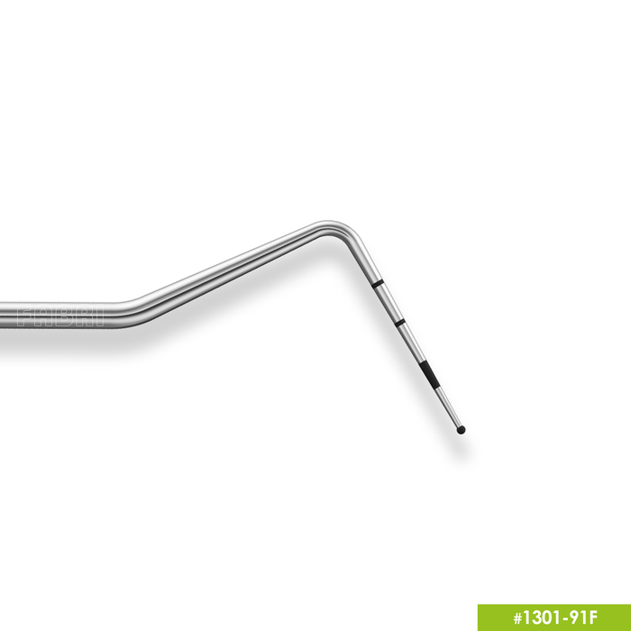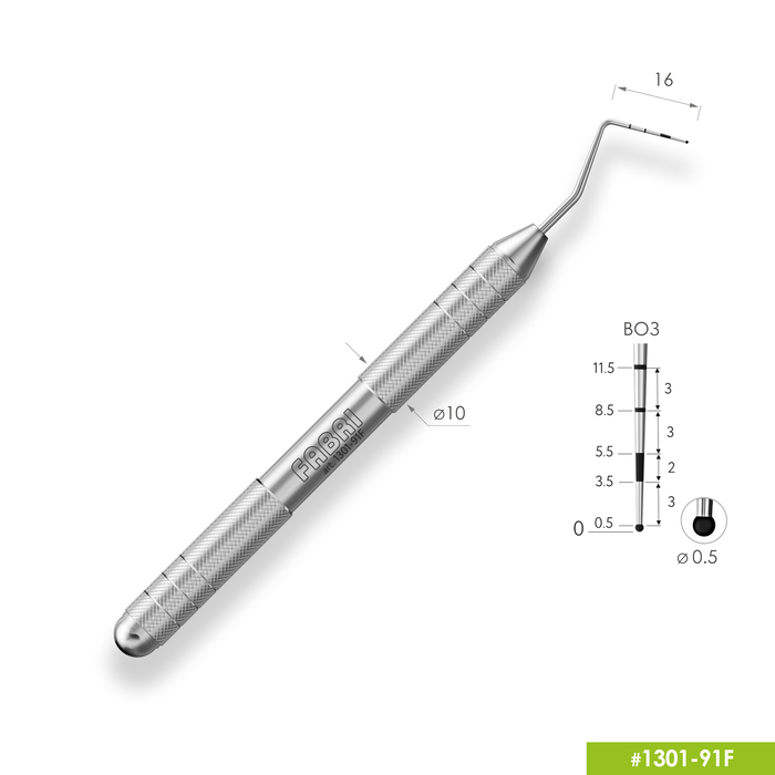 301-91F Пародонтологический мерный зонд, шкала ВОЗ от производителя Fabri — односторонний атравматичный пародонтологический мерный зонд для измерения и оценки состояния пародонтальных тканей, глубины пародонтальных карманов, уровня рецессии десны, степени обнажения корней.