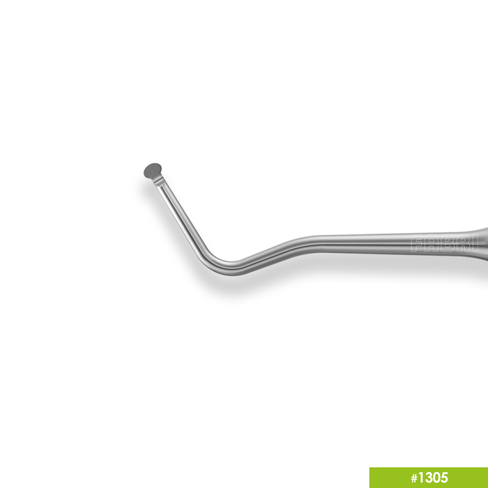 1305# Экскаватор двухугловой, диаметр 1,5 мм от производителя Fabri — двухугловой экскаватор диаметром 1,5 мм для удаления пораженных тканей зуба (эмали, дентина), временного пломбировочного материала и мягкого налета. Рабочие части, с остро заточенными кромками, имеют двойной разнонаправленный изгиб относительно ручки.