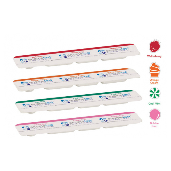 Enamelast 5% в унидозах от производителя Ultradent — 5% фторидный лак на основе смолы для лечения и профилактики кариеса и геперестезии с мультифруктовым вкусом, подслащен ксилитом.