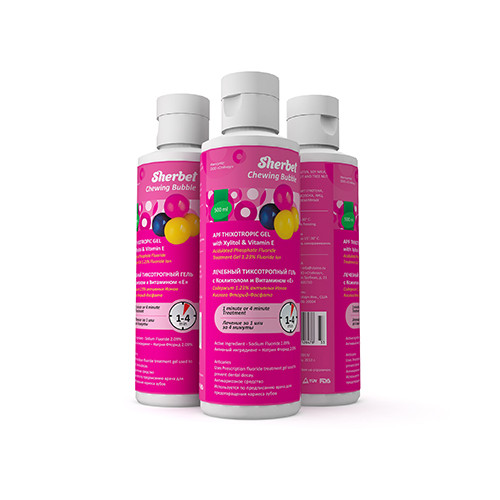 - Гель Sherbet уникален благодаря содержанию ксилита, который снижает адгезию бактерий к поверхности зуба, содержанию витамина Е, обеспечивающего эффект антиоксиданта и сенсибилизатора, а также не содержит алкоголь, глютен, соевое молоко, яйца, лесные и земляные орехи.