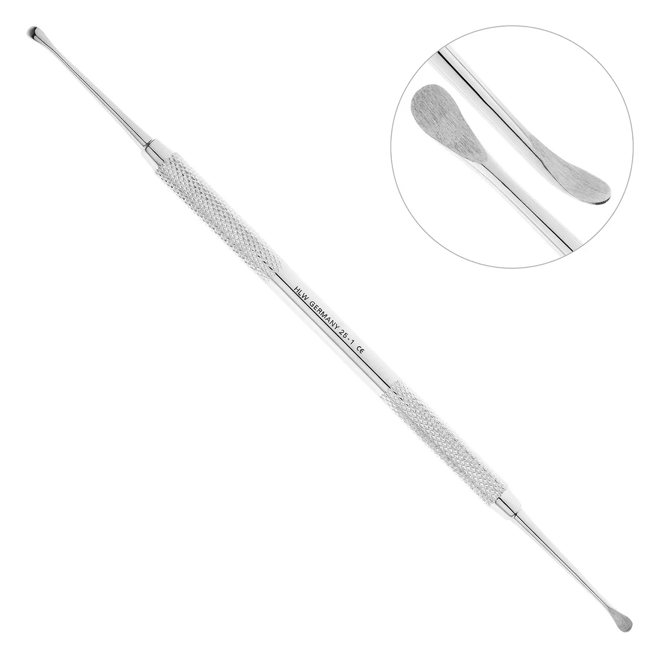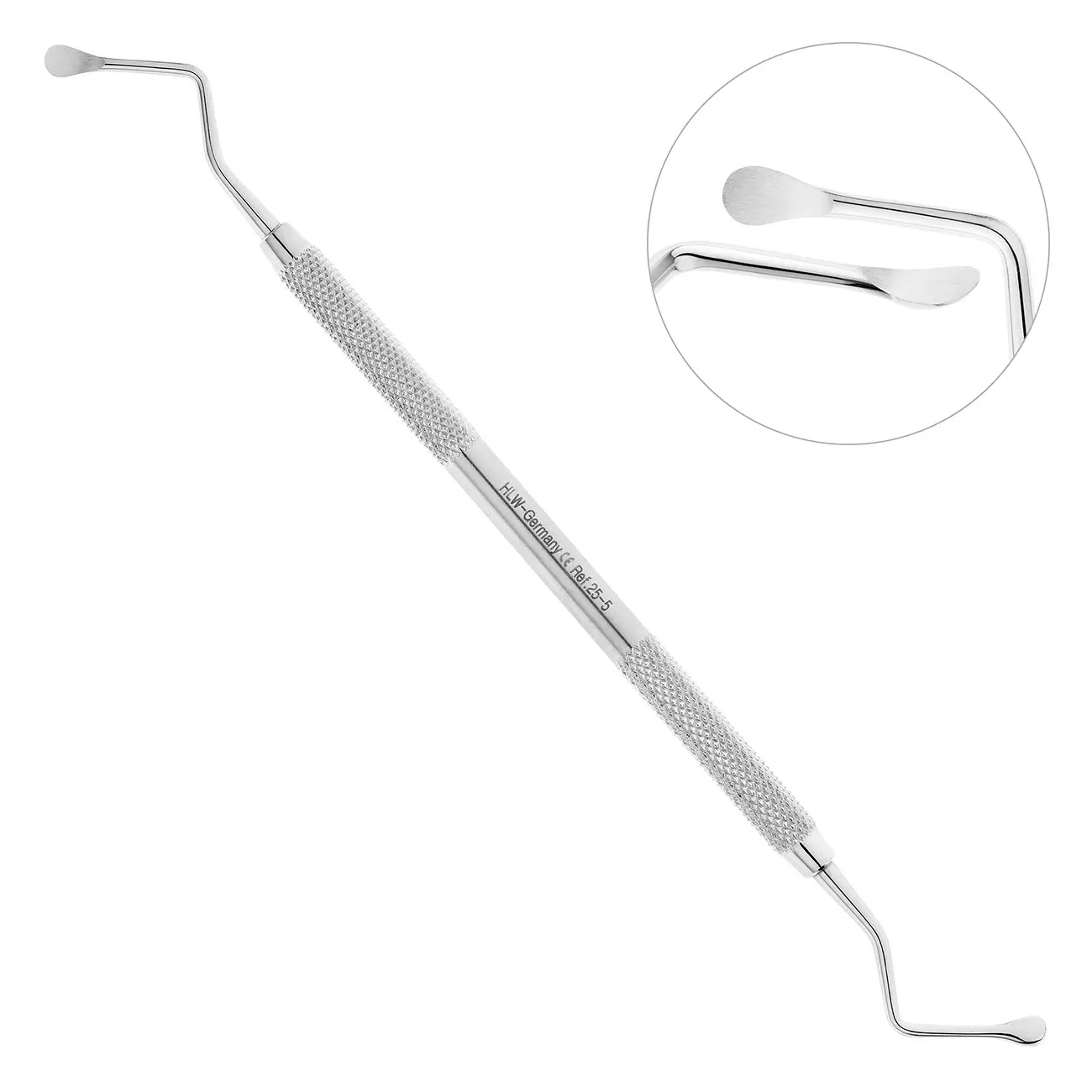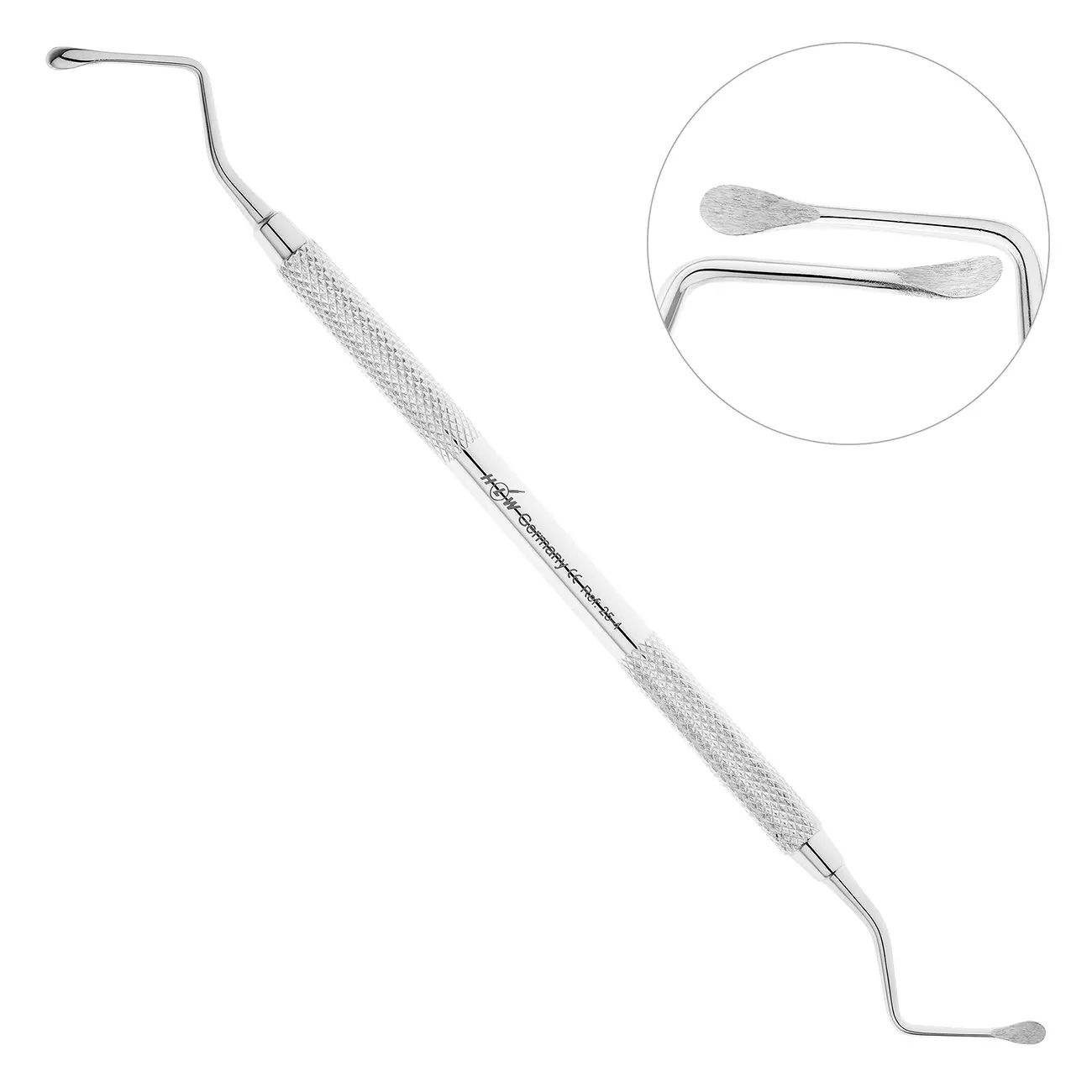С обоих концов двустороннего инструмента расположены симметричные рабочие части. Ретенционные узоры на поверхности ручки кюретажной ложки предотвращают скольжение пальцев в перчатке и позволяют снизить нагрузку на руку.