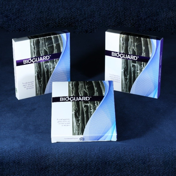 Материал обладает высокой биосовместимостью с мягкими тканями, низкой антигенностью, и не иммуногенен. Это позволяет использовать его в качестве покрытия раневых поверхностей для изоляции от воздействия факторов внешней среды и вероятности вторичного инфицирования. Материал гидрофилен, отлично впитывает кровь и надежно удерживает кровяной сгусток не меняя своей структуры, что положительно сказывается на заживлении и восстановлении мягких тканей даже при невозможности сведения краёв раны или расхождении швов. Защитное покрытие с одной стороны надежно защищает рану от воздействия факторов внешней среды и вероятности вторичного инфицирования. Материал резорбируется в течение нескольких недель. Продукты биодеградации (лизиса) стимулируют заживление раны, значительно увеличивая толщину и качество мягких тканей.