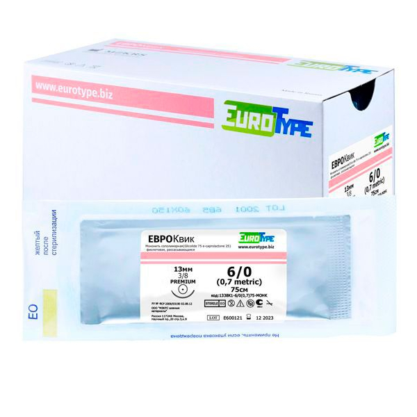 Евроквик от производителя EuroType — рассасывающийся стерильный хирургический шовный материал. Нить монофиламентная (мононить) из сополимера гликолевой кислоты (75%) и Е-капролактона (25%).