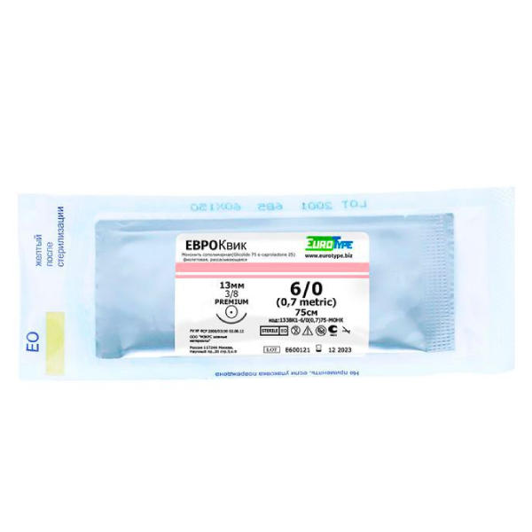 - Евроквик 6/0 75 см, 13 мм, кол. 3/8 — синтетический фиолетовый рассасывающийся шовный материал. Аналог Монокрила. Нить 6/0, длина 75 см. Игла — колющая 13 мм, 3/8 окружности (1 упаковка — 12 нитей).