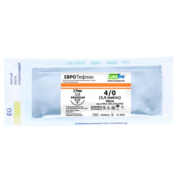- Евротефлон 4/0, 45см, 17мм, обр.реж.3/8 — синтетический белый нерассасывающийся шовный материал на основе политетрафторэтилена. Нить 4/0, длина 45 см. Игла — обратно режущая (трёхгранное тело с режущими гранями, острый кончик), 17 мм, 3/8 окружности (1 упаковка — 12 нитей).