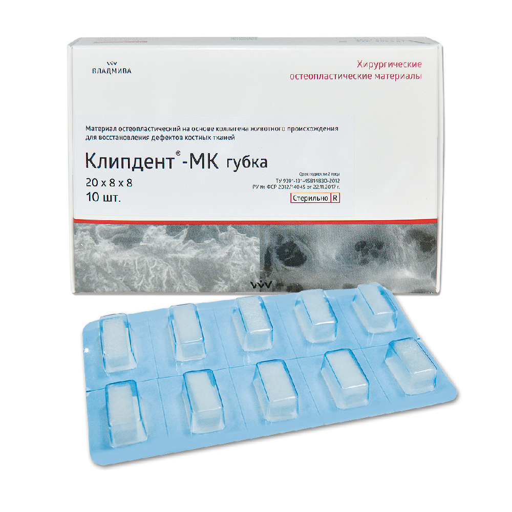 Клипдент-МК губка от производителя Владмива — материал остеопластический на основу коллагена животного происхождения для восстановления дефектов костных тканей.