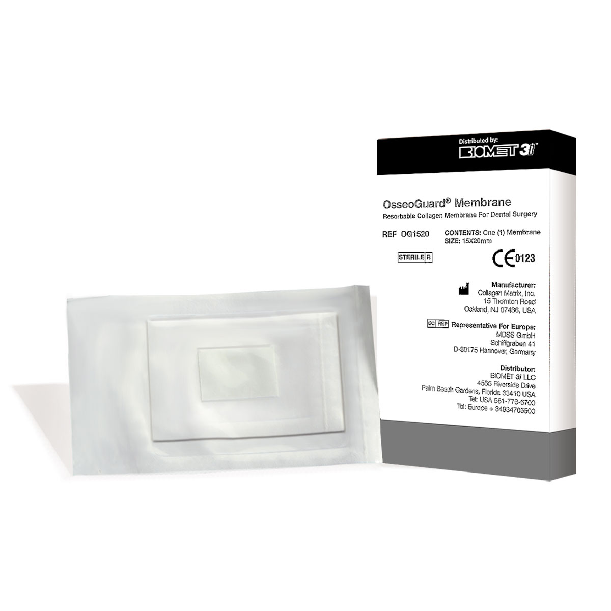 OsseoGuard: бычий коллаген I типа высокой степени очистки из ахиллесовых сухожилий. Это обеспечивает каркасные свойства и высокую прочность, которая позволяет использовать шовный материал и костные пины, сохраняя удобство мембраны при позиционировании.