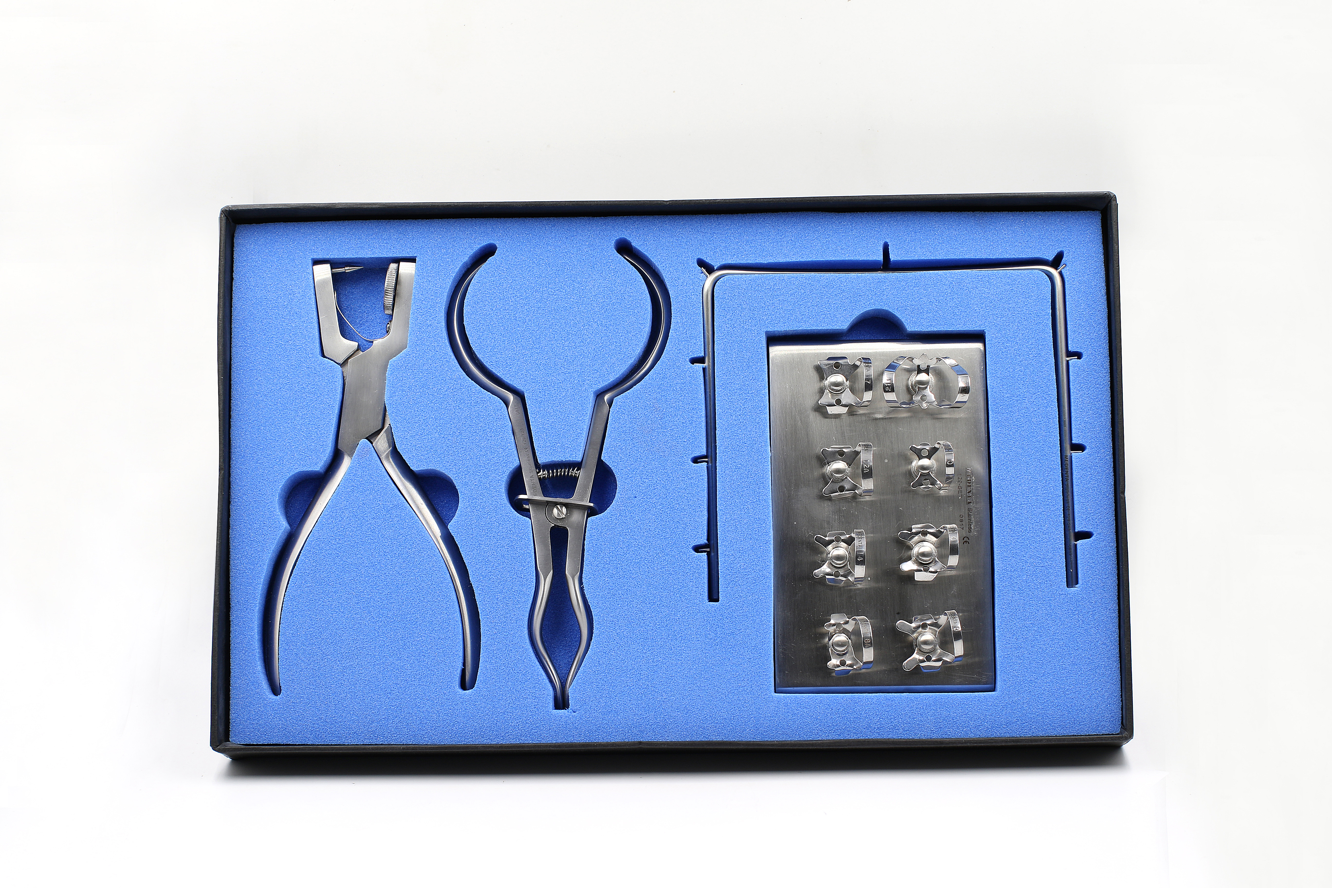 - Состоит из щипцов для наложения креплений, перфоратора-дырокола, стальных креплений для различных групп зубов, рамки и подставки для креплений. Щипцы для наложения креплений, перфоратор-дырокол, рамка и подставки изготовлены согласно ISO 9001, EN ISO 13485, 93/42/EEC из высококачественной медицинской стали марок AISI 410 и AISI 304 "Франция".