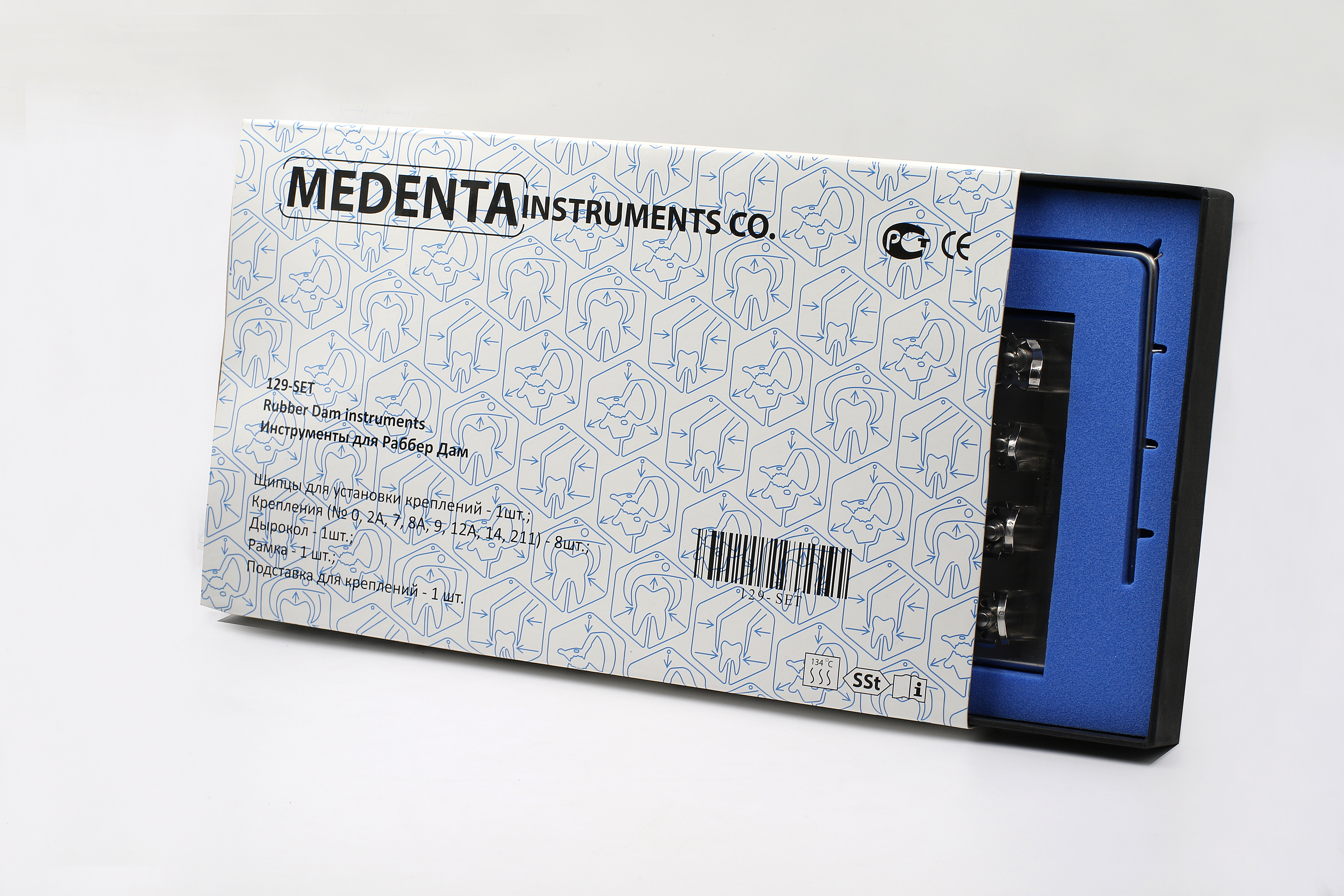 Полный набор для коффердама от производителя Medenta Instrumets Co — комплект инструментов и принадлежностей для наложения резиновой завесы «Раббер Дам Медента».