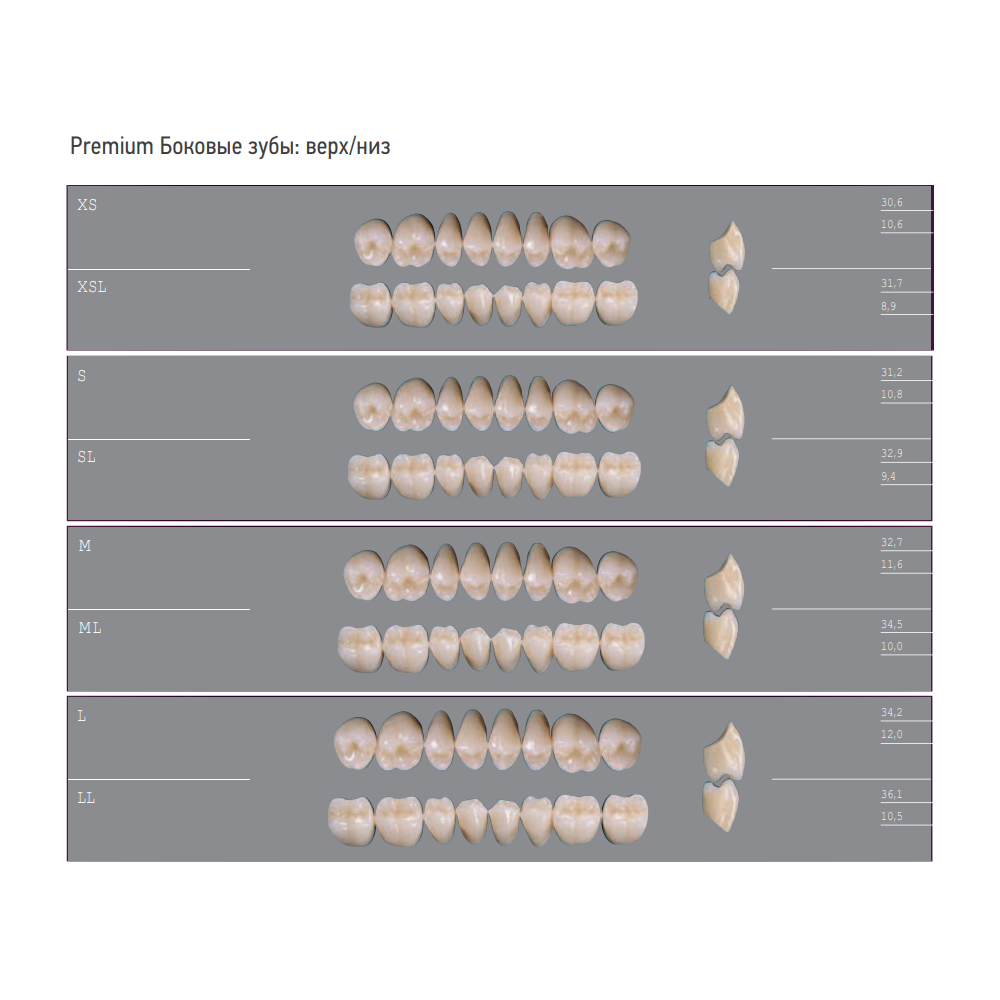 - Зубы линии Премиум изготавливаются из мультиплекс полимерных матриц (МРМ). Это высокосетчатый материал, который гарантирует адекватную функциям абразивность и выдерживает большие нагрузки, что в свою очередь является предпосылкой для естественного процесса абразии.