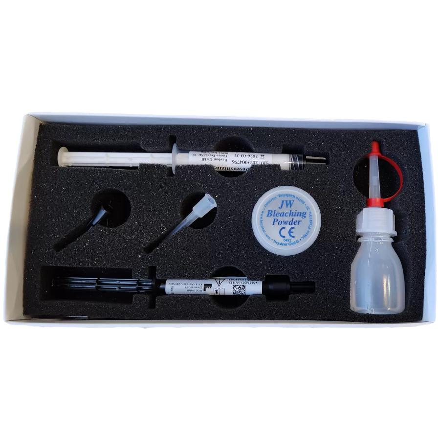 Новая формула системы отбеливания с диоксидом титана (TiO2) идеально подходит для отбеливания с использованием диодного лазера. Диоксид титана – эффективный пигмент фотокатализатора, который позволяет использовать уменьшенную концентрацию перекиси водорода в отбеливающем геле, при этом эффективность отбеливания остается по прежнему очень высокой. Теперь в комплект системы отбеливания входит еще и гель для снятия чувствительности.