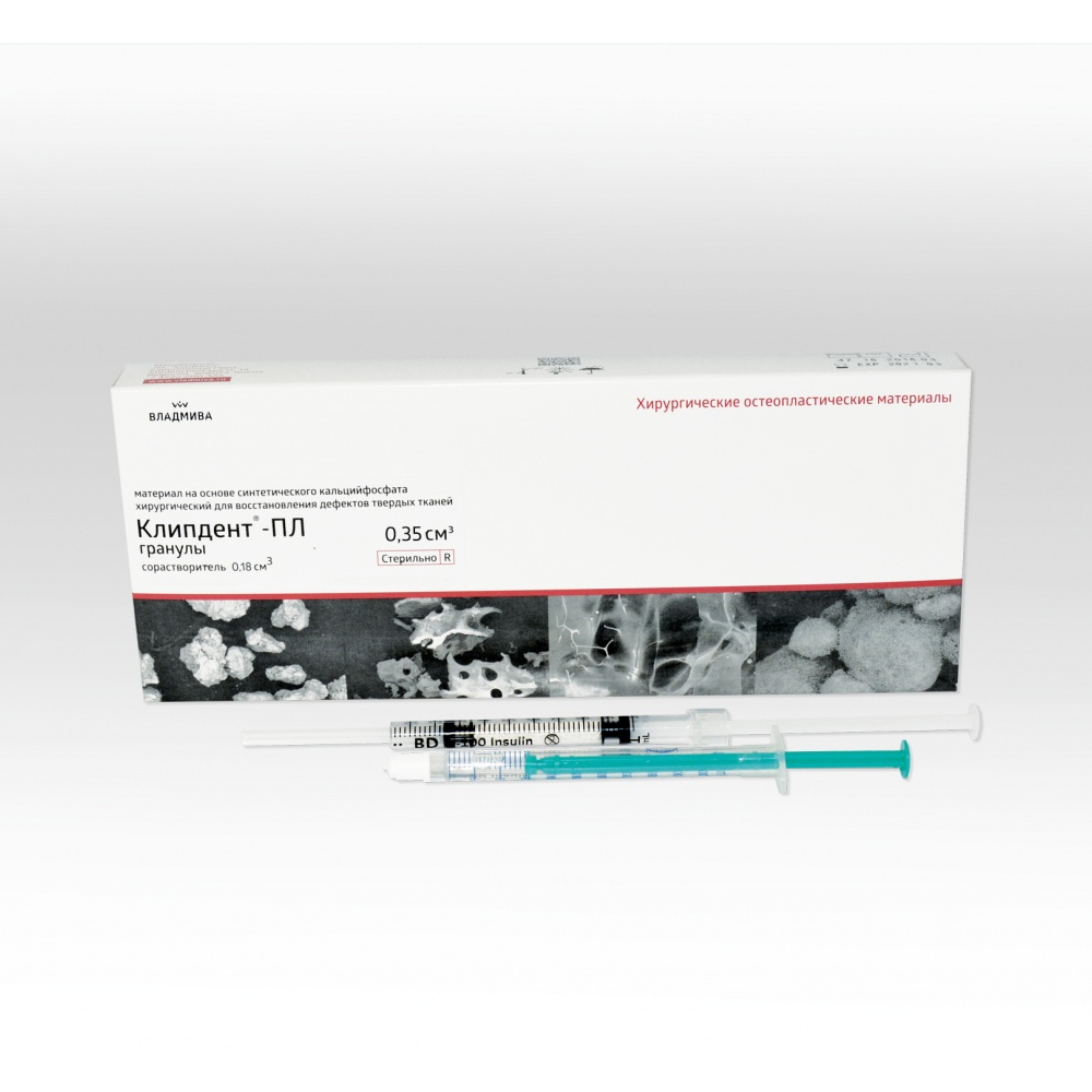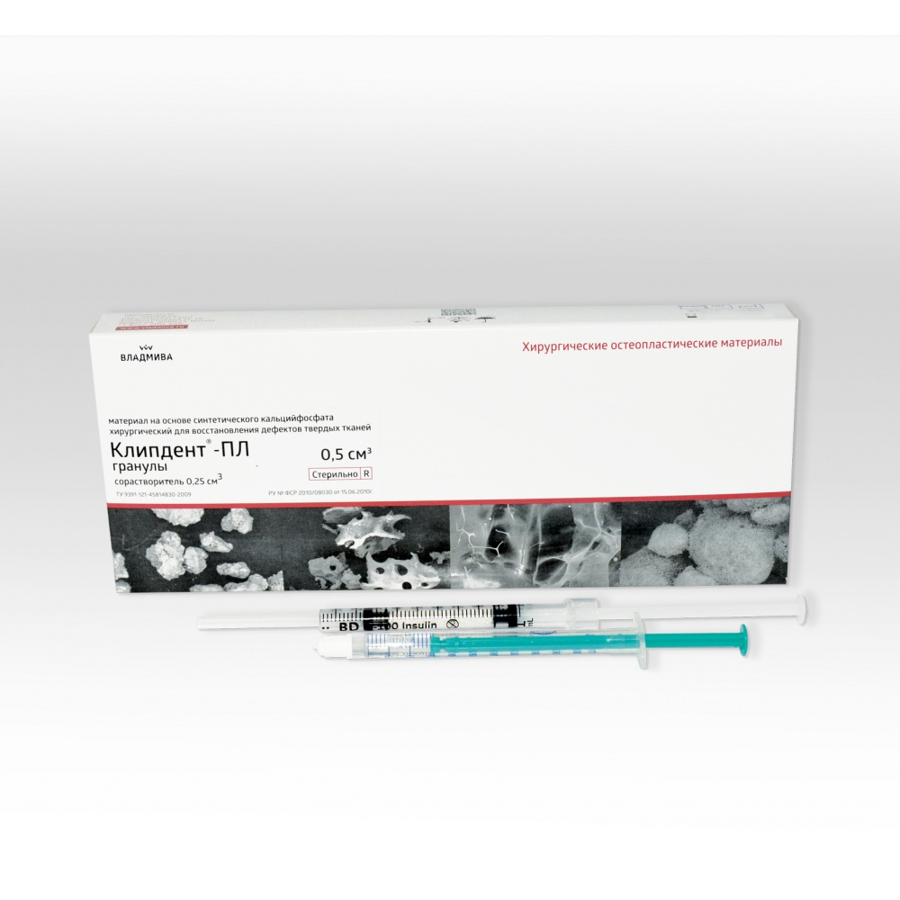 Остеокондуктивный материал «Клипдент-ПЛ сорастворитель» состоит из гранул -трикальцийфосфата (-ТКФ) покрытых тонкой оболочкой биодеградируемого сополимера полилактидгликолида и сорастворителя. После смешивания гранул с сорастворителем, гранулы склеиваются между собой, образуя пластичный материал с высокой микро- и межгранулярной пористостью, который можно вводить в костный дефект непосредственно из шприца. При контакте с кровью или ротовой жидкостью материал приобретает форму костного дефекта, что обеспечивает стабильность его в дефекте и облегчает процедуру ушивания раны. Биоматериал полностью резорбируется в течение 9–15 месяцев. Резорбция протекает параллельно регенерации костной ткани.