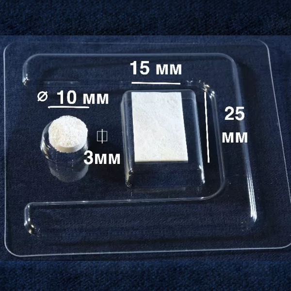 Диск костного минерала в объёме 0,3 куб.см. представляет собой смесь различных фракций: 2/3 части фракции крошки и 1/3 часть фракции чипсов, которые в свою очередь можно превратить в крошку подвергнув незначительной компрессии металлическим инструментом.