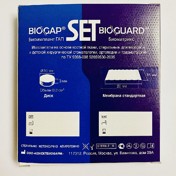 Набор Biogap/Биоимплант ГАП крошка (0,3см³) + Bioguard/Биоматрикс мембрана стандартная (15х25мм) от производителя Конектбиофарм.