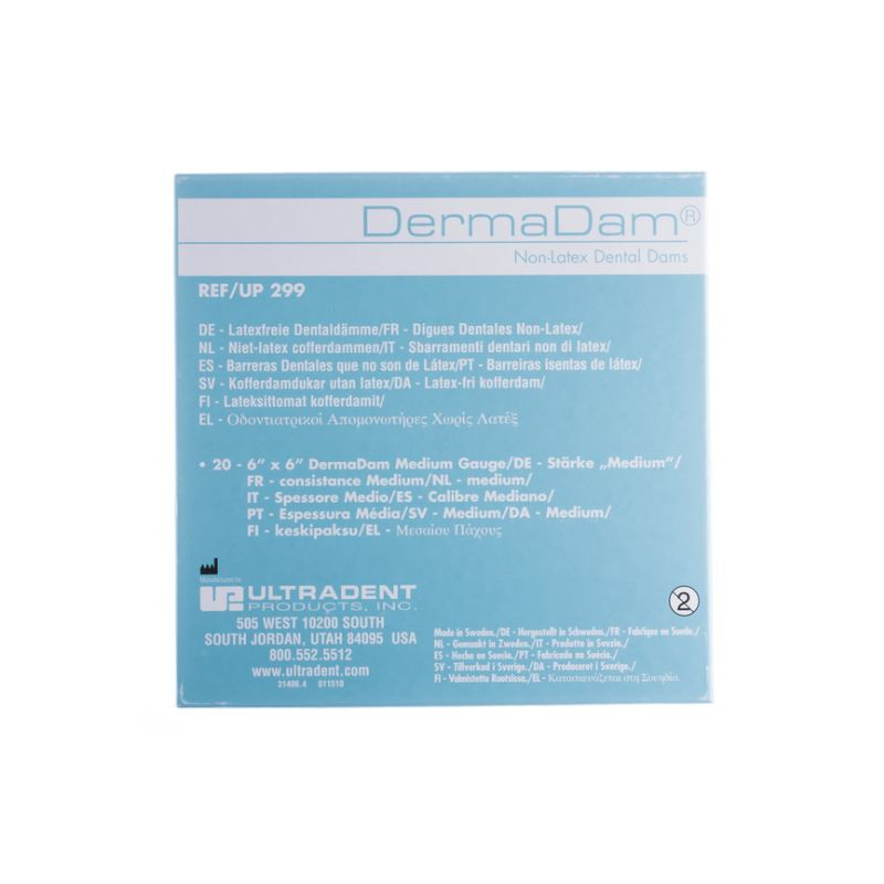 Листы безлатексные для раббердама DermaDam Synthetic (20 шт.) от производителя Ultradent — синтетический раббердам без содержания латекса (толщина 2 мм, размеры 15 х 15 см, 20 шт. в упаковке).