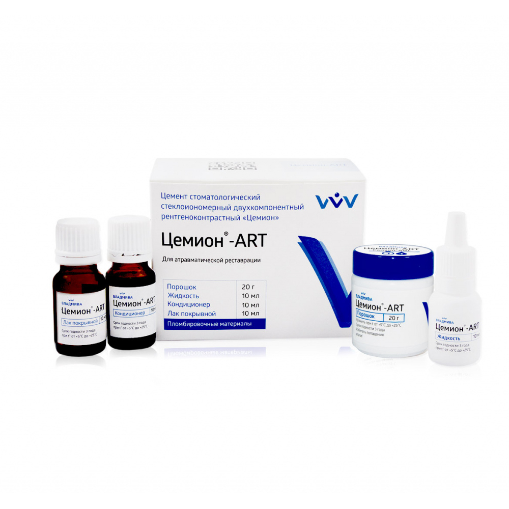Цемион-ART от производителя Владмива — цемент стоматологический стеклоиономерный двухкомпонентный рентгеноконтрастный для атравматичного восстановительного лечения кариеса зубов (ART-методика), предусматривающий только ручную обработку кариозной полости или минимальное использование бормашины. ART-методика применяется как во взрослой, так и в детской стоматологии.