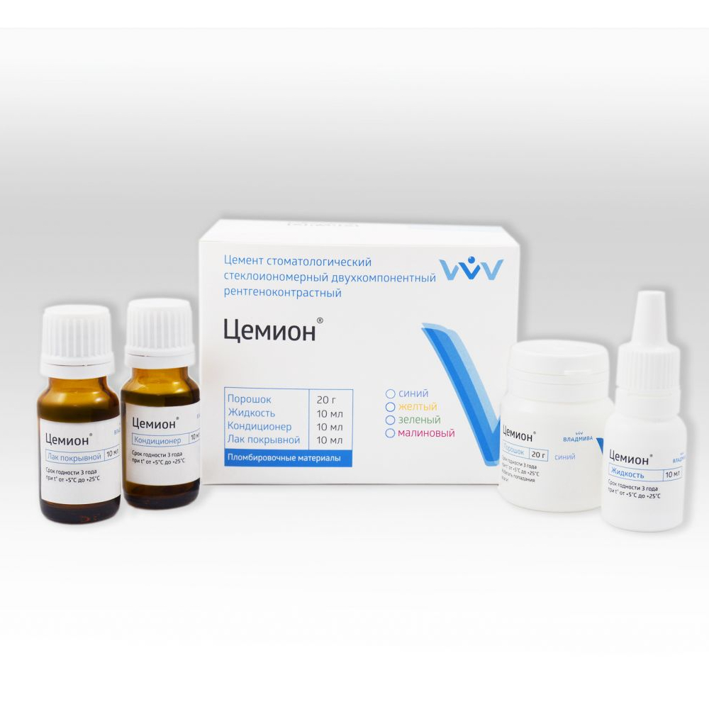 Цемион — стоматологический стеклоиономерный двухкомпонентный рентгеноконтрастный цемент от производителя Владмива.