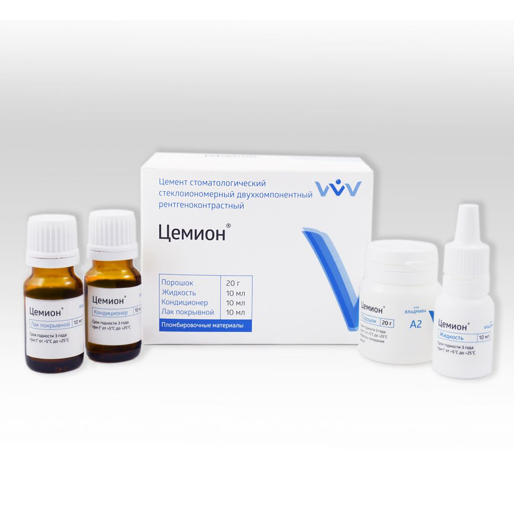 Стеклоиономерный универсальный рентгеноконтрастный материал Цемион от производителя Владмива – традиционный стеклоиономерный цемент химического отверждения, обладающий химической адгезией к дентину и эмали.