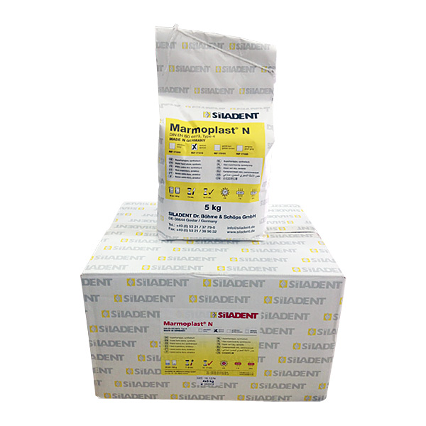 Гипс Marmoplast N,Siladent - укрепленный смолой, суперпрочный гипс с низким коэффициентом расширения для изготовления работ требующих высокой стабильности краев. Marmoplast N не так легко раскалываются как другие гипсы данного типа твердости. Модели отличаются супергладкой поверхностью. Область применения: отливка рабочих моделей под мосты, коронки, также моделей применяемых при протезировании на имплантатах, мастер моделей при работе с драгоценными и недрагоценными металлами, контрольных моделей.