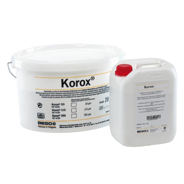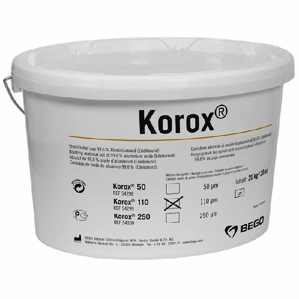 Песок Кorox от производителя Bego — оксид алюминия для пескоструйной обработки, содержащий 99.6% оксида алюминия.