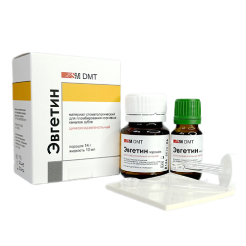 Эвгетин от производителя SM DMT (новый бренд "TehnoDent") — материал стоматологический для пломбирования корневых каналов зубов. Выпускается в комплекте порошок/жидкость и относится к цинкоксидэвгенольному классу.