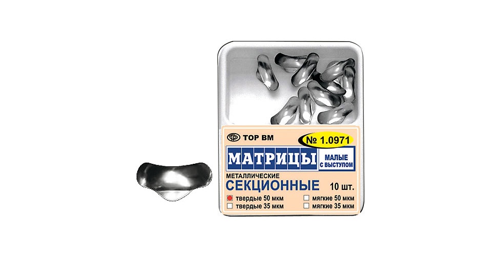 - Матрицы контурные секционные металлические предназначены для разделения аппроксимальных поверхностей соседних зубов при реставрации II типа.