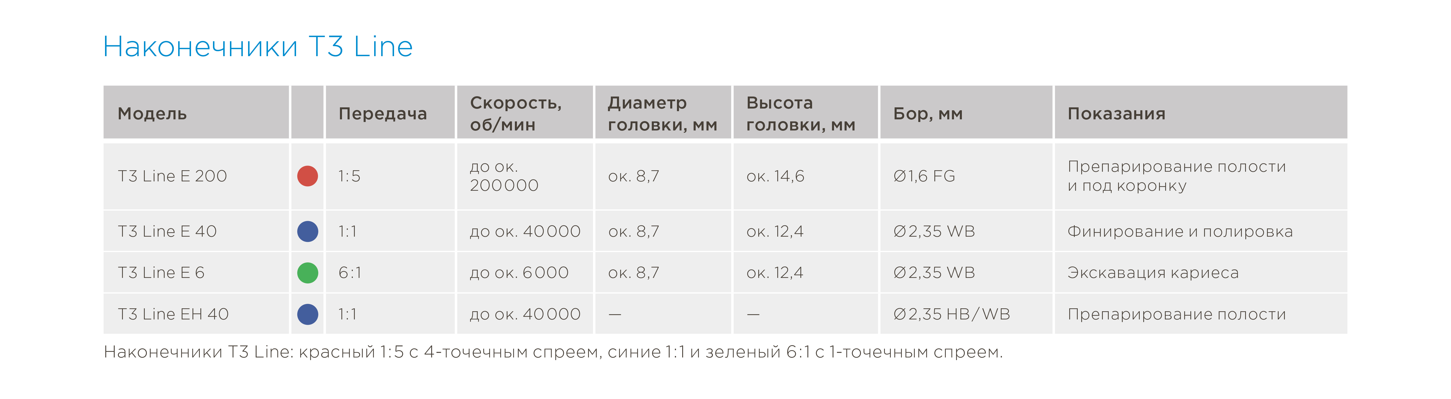 - Артикул 6392687 — T3 Line E 40, передача 1:1, одноточечный спрей, высота головки 12,4 мм, для боров WB Ø2,35 мм, скорость до 40000 об/мин;