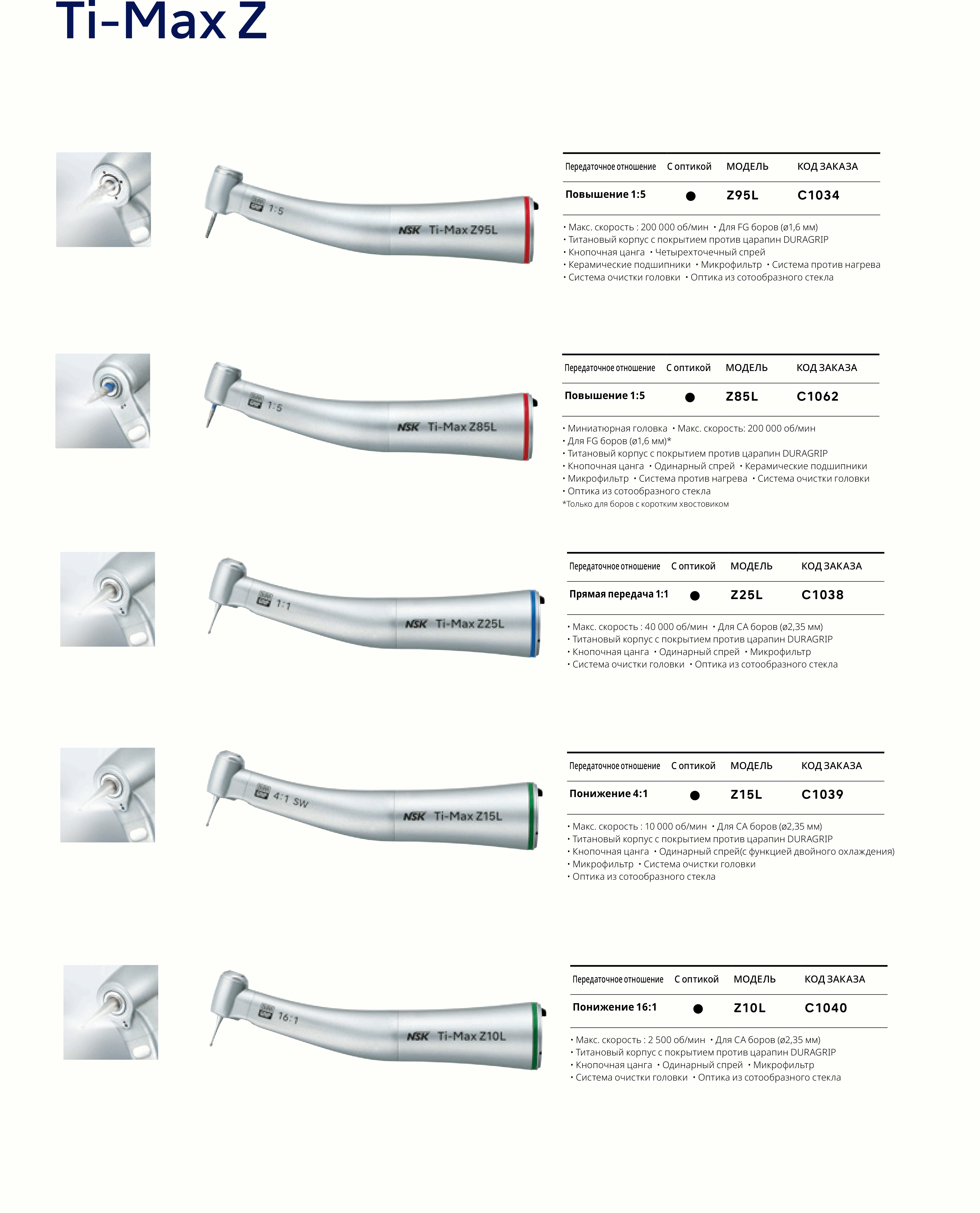 - Артикул C1034 — Ti-Max Z95L, повышающая передача 1:5, 4-точечный спрей, для боров FG Ø1,6 мм, керамические подшипники, система против нагрева, скорость до 200 000 об/мин.