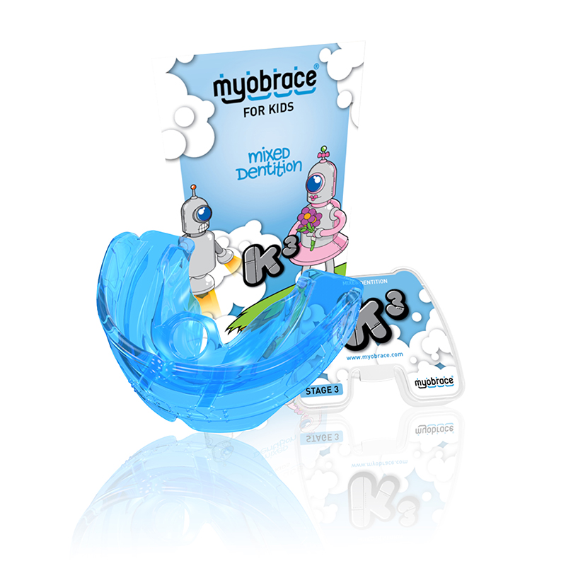 Трейнер Myobrace K3 от производителя MRC разработан специально для детей и учитывает особенности анатомии еще несформированного до конца зубного ряда. Он предназначен для исправления вредных привычек, выравнивания зубов, а также помогает стабилизировать нёбное положение языка. Предназначен для завершающего этапа лечения — 3 этапа выравнивание зубных рядов и ретенция.