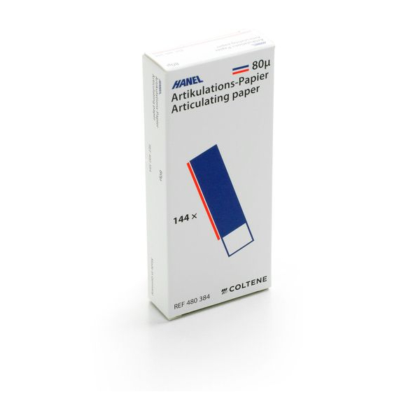 Артикуляционная бумага Hanel (I-форма) 80мкм от производителя Coltene — артикуляционная бумага I-образной (прямой) формы, покрытая с обеих сторон краской, используется в гнатологии. Обладает высоким маркирующим эффектом. При использовании на моделях может использоваться многократно, так как красящее покрытие обладает способностью к регенерации.