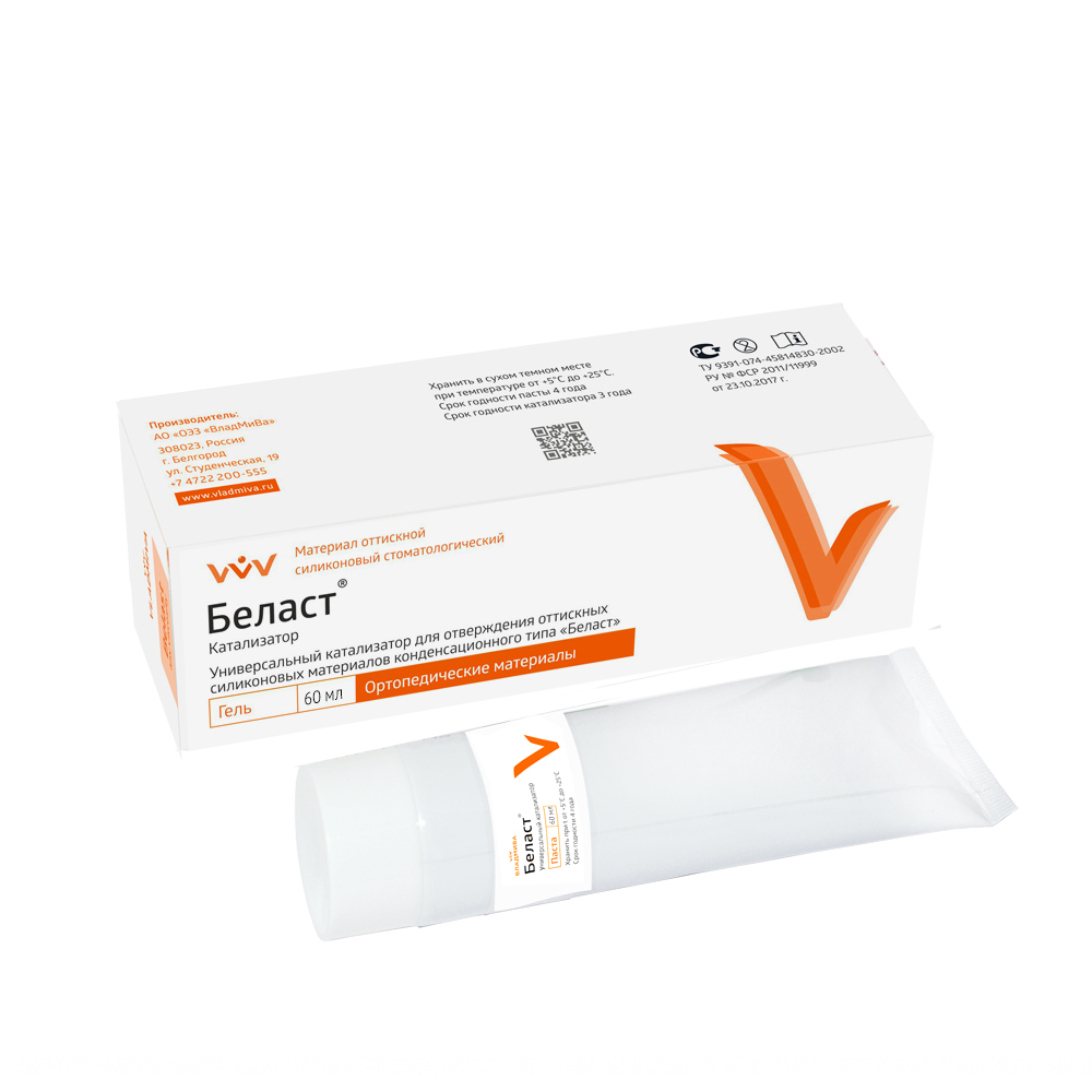 Беласт катализатор от производителя Владмива — универсальный гелеобразный катализатор для конденсационных силиконовых материалов при получении точных оттисков различных твердых и мягких тканей протезного поля.