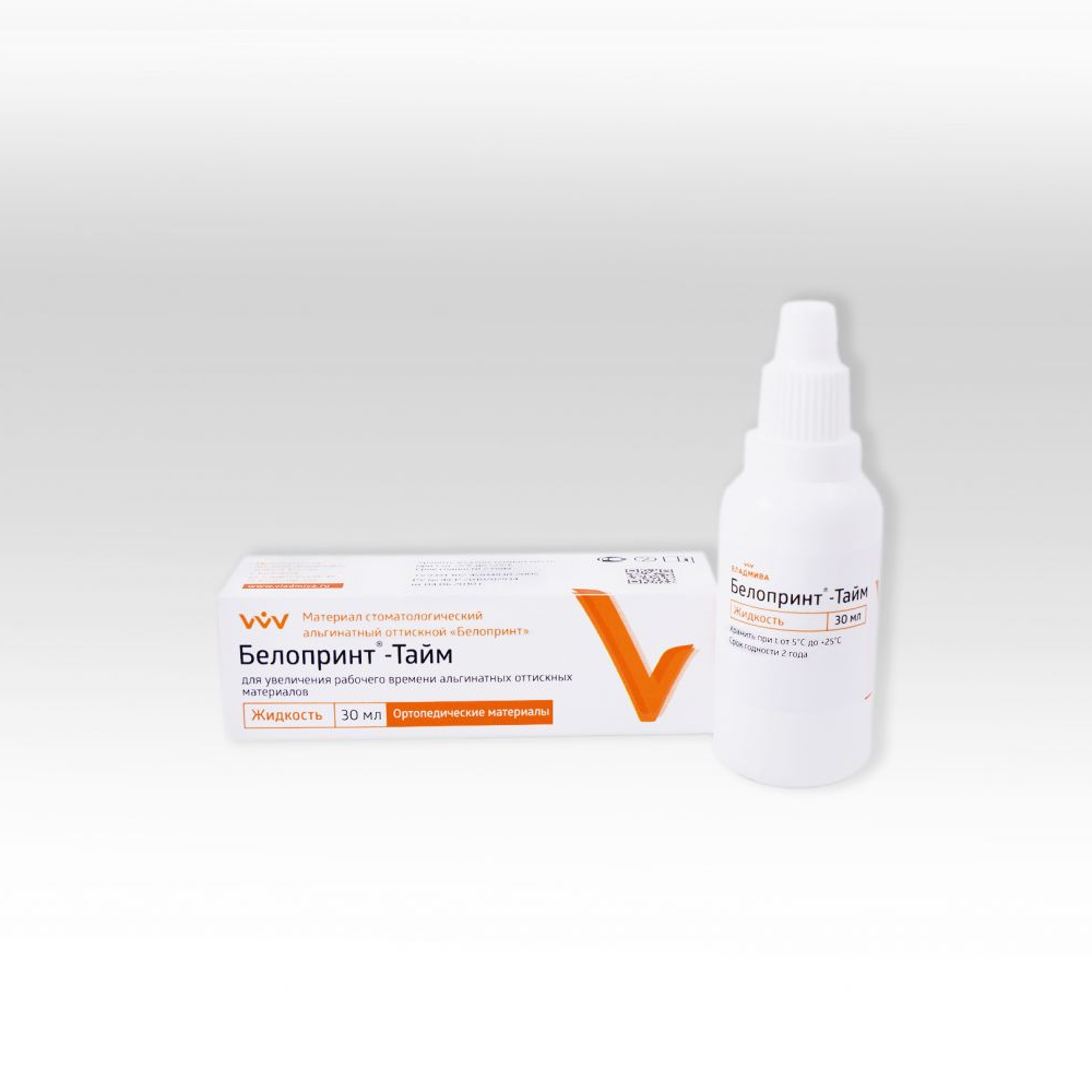 Белопринт Тайм от производителя Владмива — жидкость для увеличения рабочего времени альгинатных оттискных материалов серии Белопринт.
