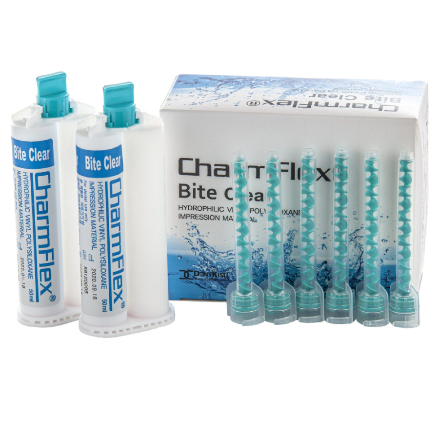 CharmFlex Bite Clear от производителя DentKist — материал для получения слепков прикуса, класс I по DIN 13903 на основе силикона с оксидом цинка, без эвгенола, гидрофильный.