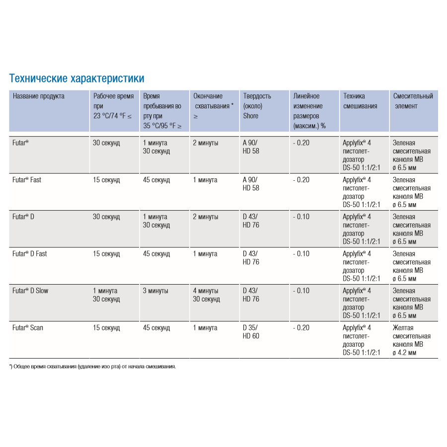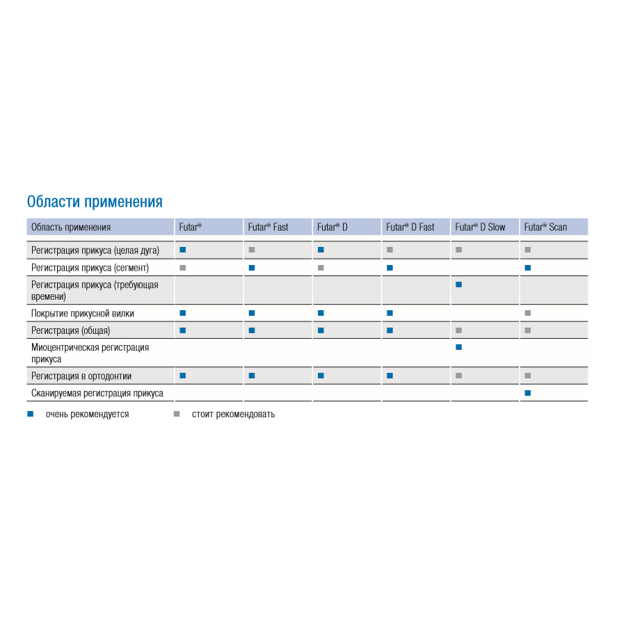 - Очень длительное рабочее время (90 секунд) для самых разных областей применения, например, для индивидуального формирования края, в качестве материала для фиксации или изоляции, для миоцентрической регистрации или для всех тех случаев, когда в клинике или в лаборатории требуется особенно твердый А-силикон.